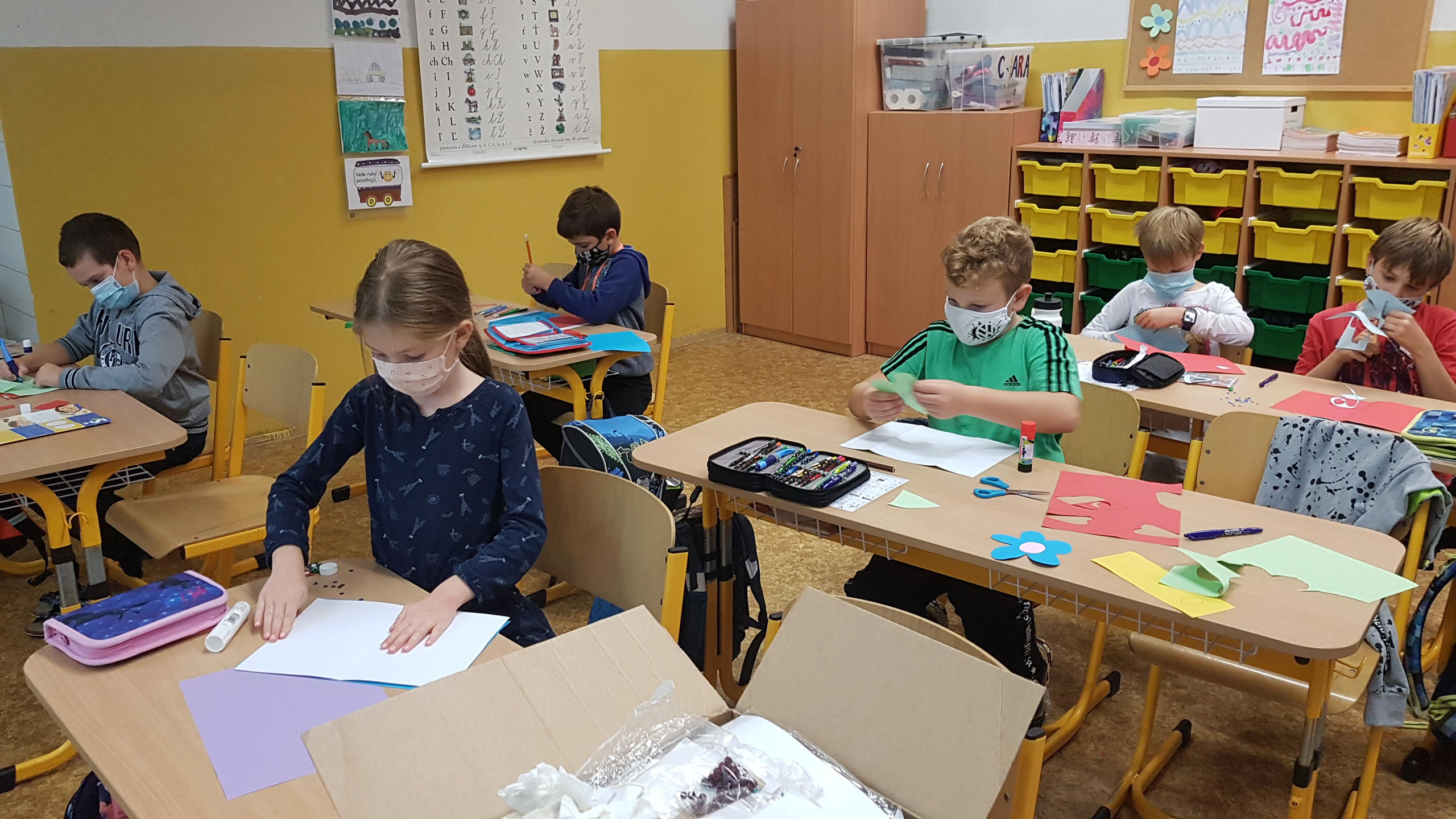 Chlapci aj dievčatá s nadšením začali tvoriť z výkresu a farebného papiera, pomohli si nožnicami, lepidlom, peknými nálepkami, farbičkami a pastelkami.