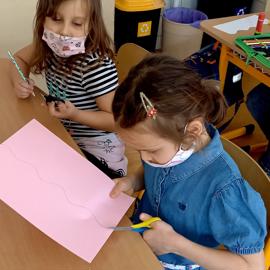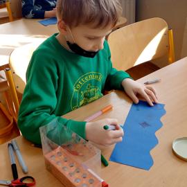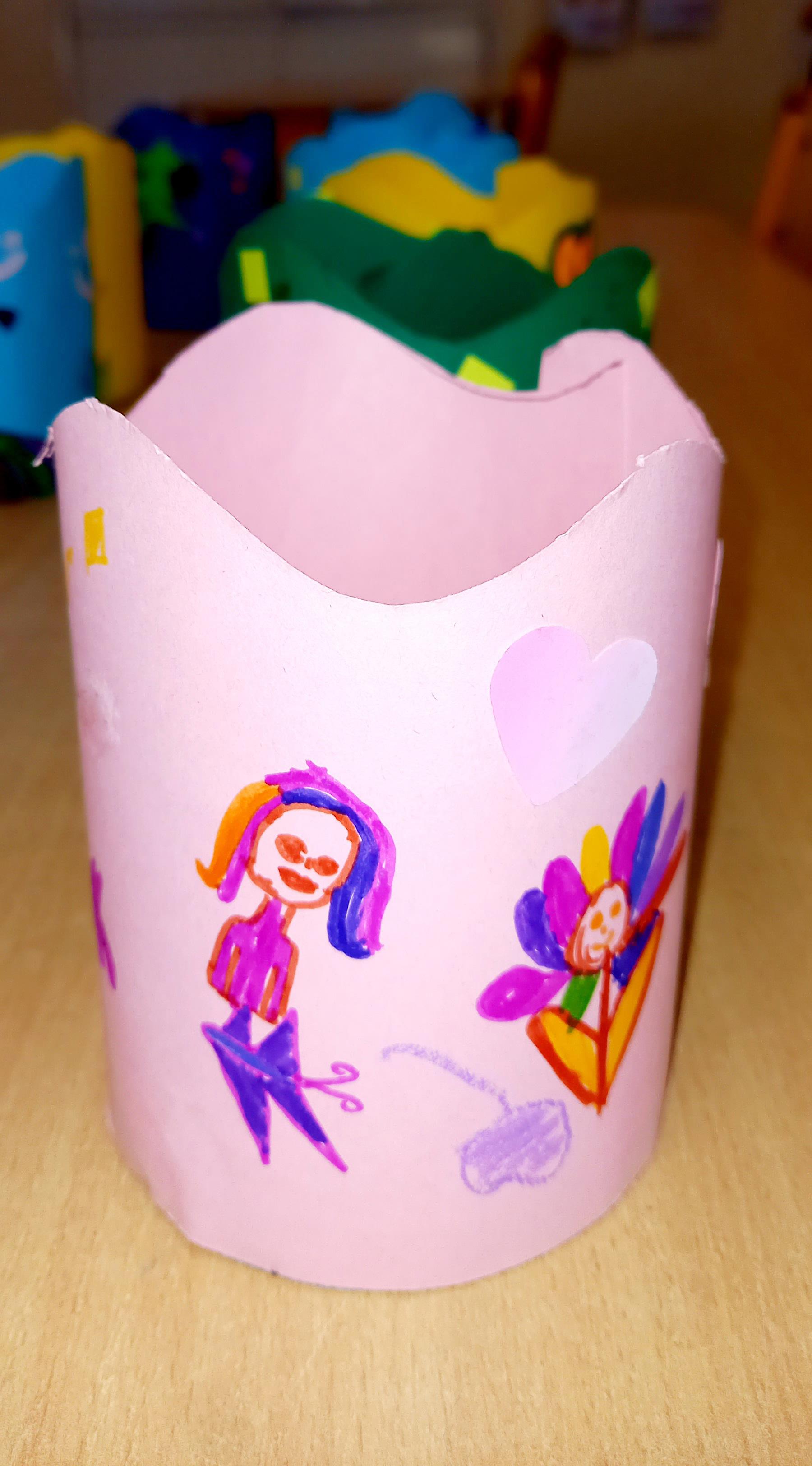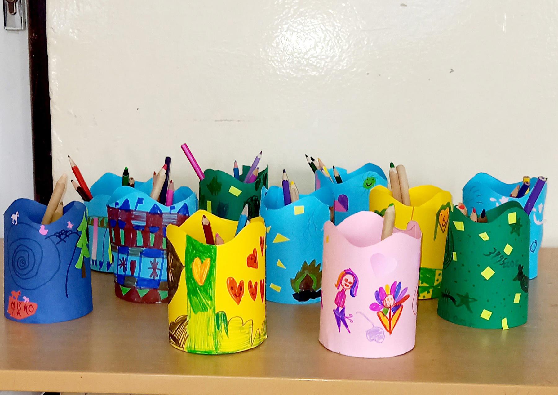 Rozprávali sme sa o tom, ako majú doma na pracovnom stole vyriešené odkladanie napríklad farbičiek, fixiek....a iných školských potrieb. Dávam im otázku, na čo všetko by sa dalo využiť ešte viečko so zaváracieho pohára. Deti majú priestor na komunikáciu... Povedali sme si, ako my využijeme už použité viečko zo zaváracieho pohára. Prejdeme k výtvarnej tvorbe. Deti si vybrali každé podľa seba farbu výkresu, ktorá sa im páči. Vystrihli sme si „telo“ pohárika, ktoré sme vyzdobili farebnými papiermi a vyfarbili. Pripravili sme si obojstrannú lepiacu pásku potrebnej dĺžky a vlepili sme výkres do vrchnáčika. Poháriky sme hneď aj vyskúšali, ako v ňom držia farbičky. Vystavili sme si hotové výrobky v triede, chvíľku nám poslúžia na výzdobu, potom si ich deti vezmú domov na svoj pracovný stôl.